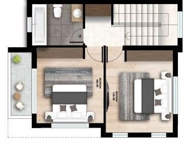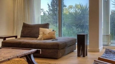 The 2-bedroom semi-detached fully furnished house follows a modern modular design with exterior wood finishes and private landscaped gardens with mature trees and a convenient automatic irrigation system.