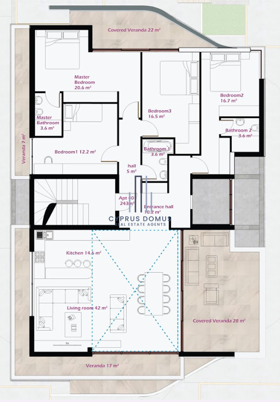 One of the standout features of this penthouse is the private swimming pool, perfect for enjoying the warm weather and relaxing in privacy. Large windows fill the living spaces with natural light, while the open-plan layout creates a welcoming atmosphere.