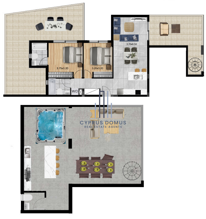 This exclusive 2-bedroom penthouse apartment features an impressive internal space of 85 m², offering two spacious bedrooms and two bathrooms. Large windows invite natural light, while thoughtful layouts ensure privacy and convenience for every resident.