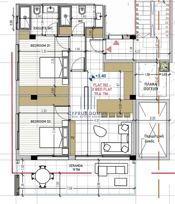 This modern apartment offers a comfortable lifestyle with a well-designed internal space of 75.6 m² featuring two bedrooms and two bathrooms.
