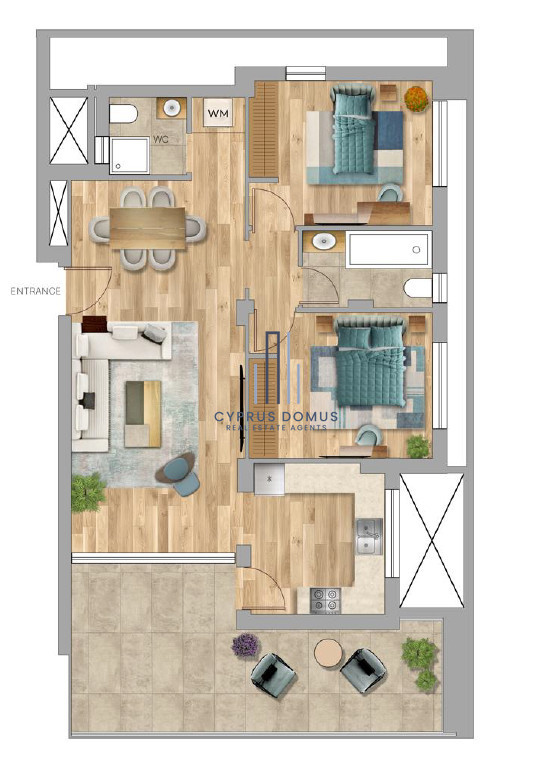 For sale is a modern two-bedroom apartment in the desirable area of Pyrgos Lemesou. This well-designed home offers an internal space of 82 square meters and is situated on the first floor of a three-story building within a secure, gated complex.