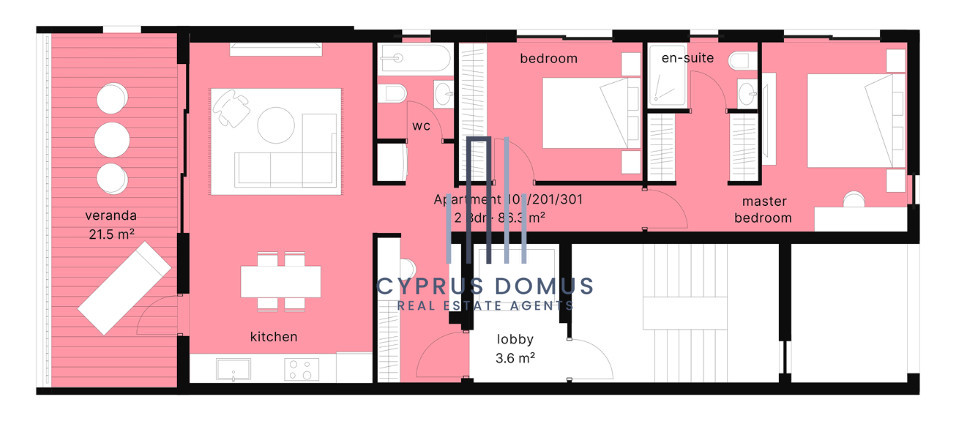 This modern residence offers a comfortable internal space of 86.3 square meters, thoughtfully designed to maximize every inch. The property features two spacious bedrooms and two bathrooms (1 ensuite).